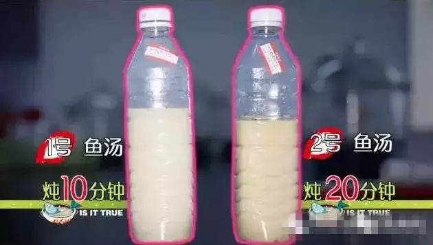 央视财经《是真的吗?》节目曾经自炖鱼汤作为检测样本进行实验检测。记者选取了最常见的鲫鱼炖汤。为了实验的统一性,特别选取了四条大小、重量相同的鲫鱼,分成两份,使用同样做法进行熬制,但熬制时间不同,分别是10分钟和20分钟。
