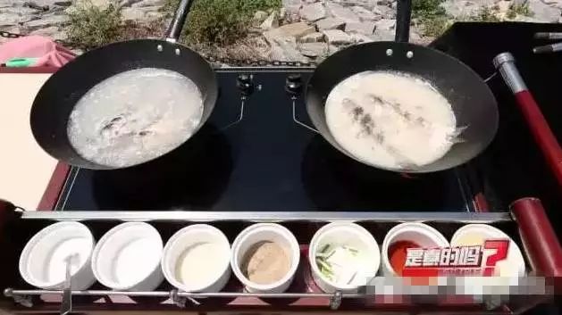 10分钟后,小火慢炖的鱼汤已经呈现出淡淡地乳白色,鱼肉也随着汤汁不断翻滚。随后将火熄灭。另一锅鱼汤则继续慢炖,20分钟后,鱼汤已呈现深深的奶白色。