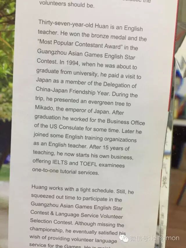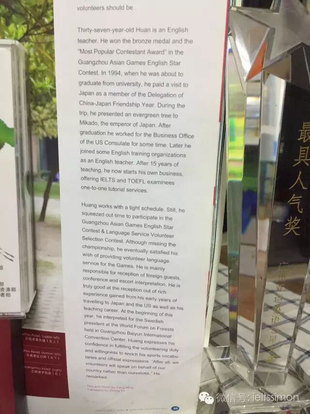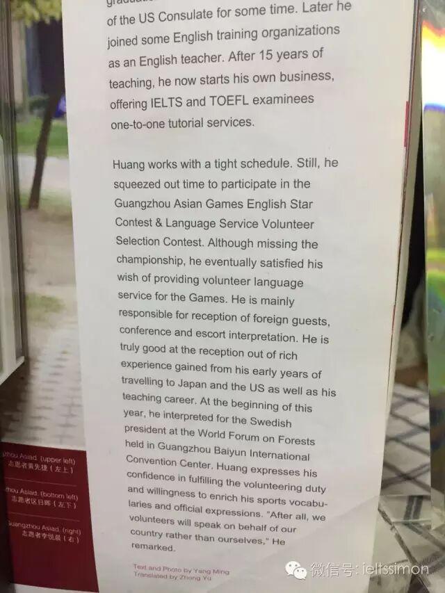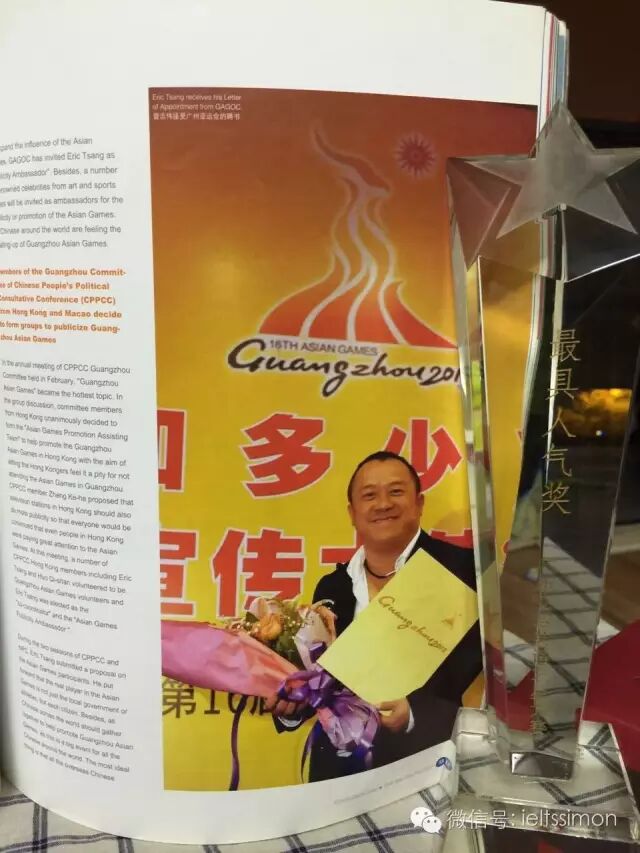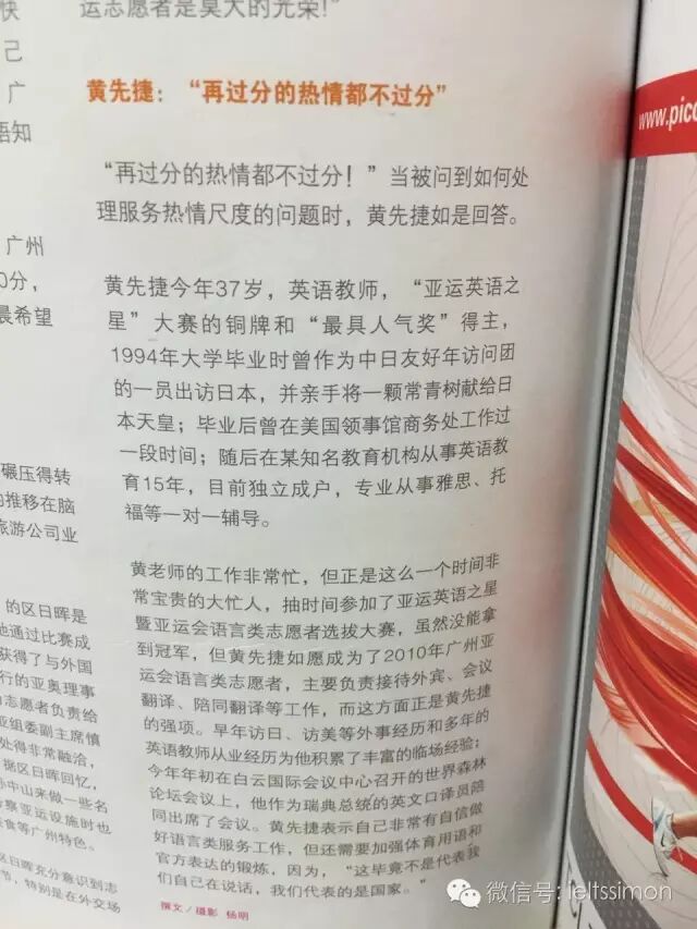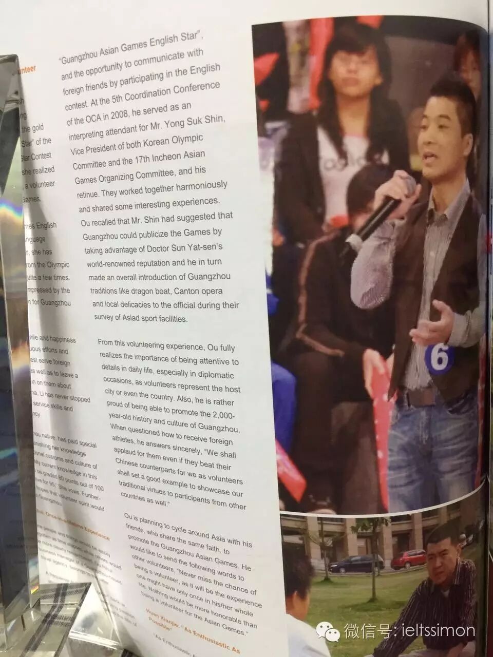 2010年亚运会亚组委官方刊物刊登的关于信捷哥的文字及图片介绍。同期杂志也介绍了曾志伟和邓亚萍等各界志愿者。