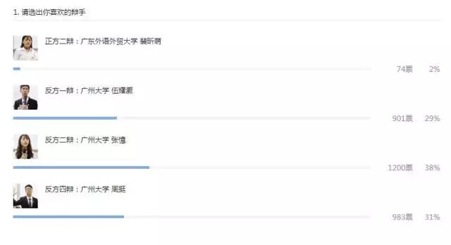 本场比赛四名待定席辩手中,广州大学辩手周挺、张憶分别以38%、31%的得票率成功晋级个人赛: