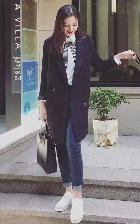 学院风牛角扣大衣搭配卷边牛仔裤+帆布鞋+格纹流苏围巾,整体造型十分干净,很有文艺范儿。