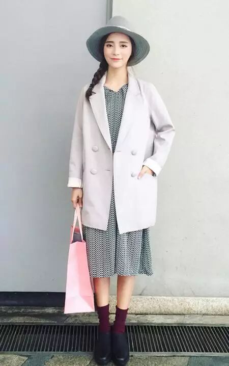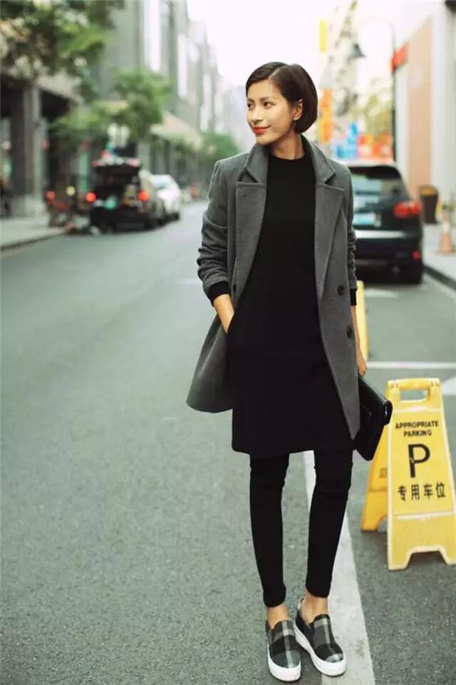 黑色系搭配,大衣加上连衣裙,欧美简洁风。