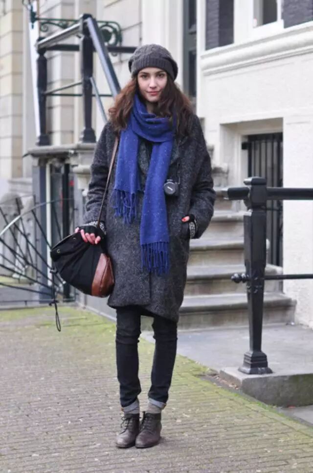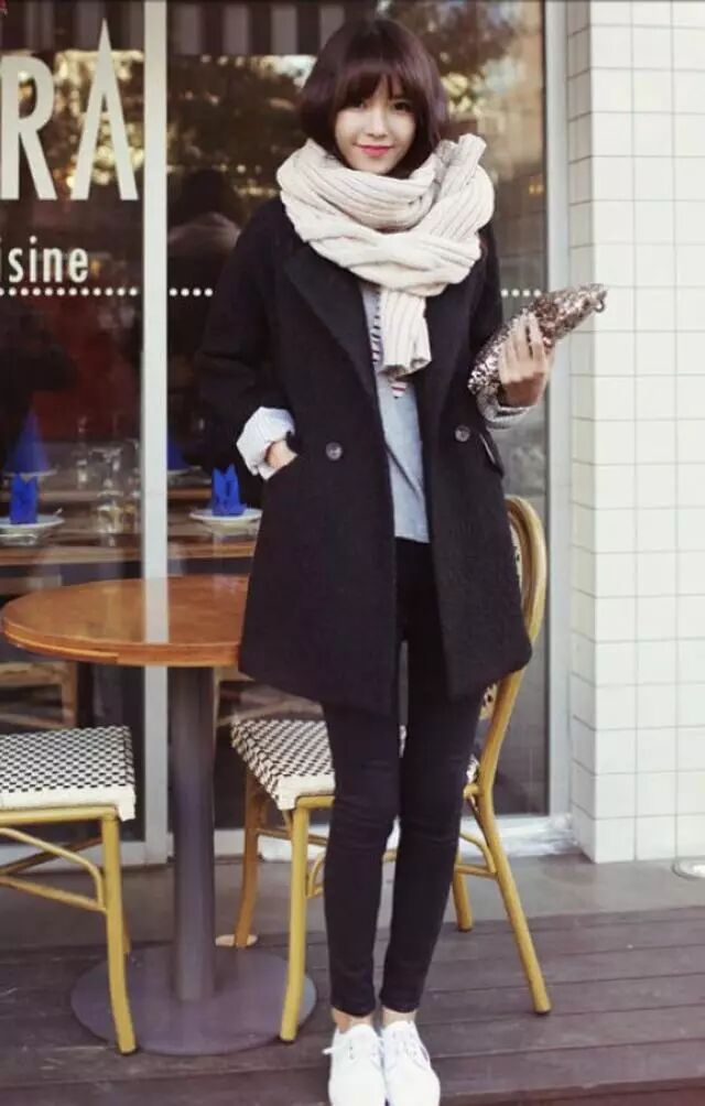 当全身都是黑灰色系的时候,不妨用鞋子和围脖点亮自己哟!一下子就清新了起来呢。