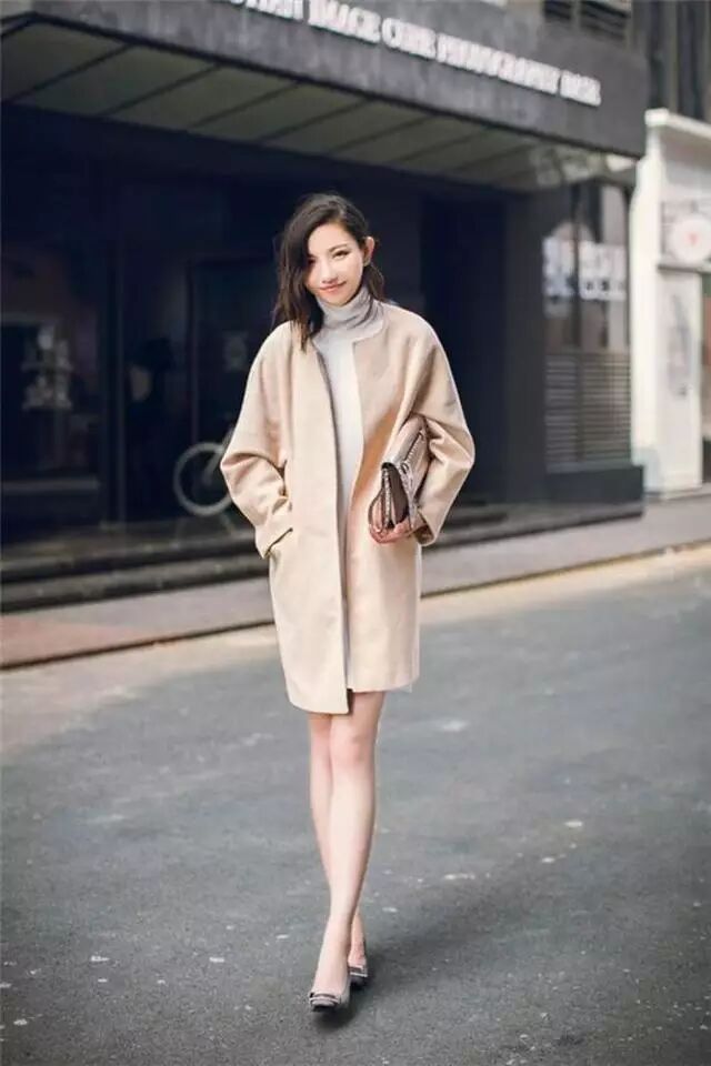 高领白色打底衫加浅色大衣,给人温暖优雅的感觉,适合OL。