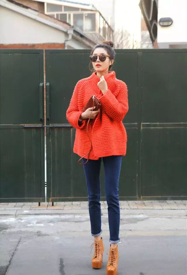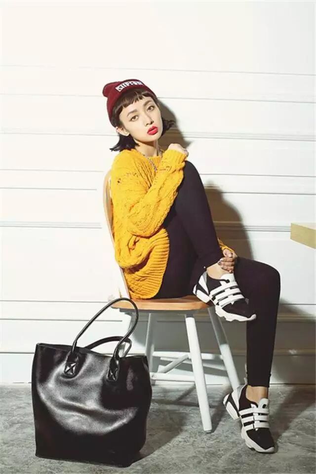 宽松毛衣破洞设计,十分显瘦,颜色亮丽,加上百搭运动鞋,活泼率性。