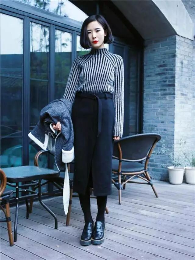 黑灰竖条纹毛衣,搭配开叉半身裙和羊羔毛外套,简约气质。