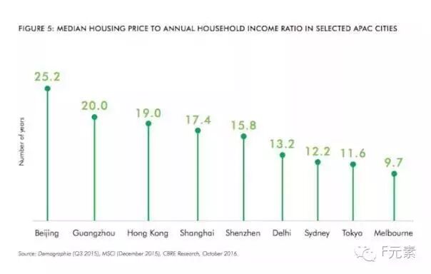根据 CRBE 的这份报告,北京房价在亚洲市场是最高的。这里的千禧一代至少要花 25.2 年的全部收入才有可能支付得起一套房产,而广州、上海分别为 20 年、17.4 年。