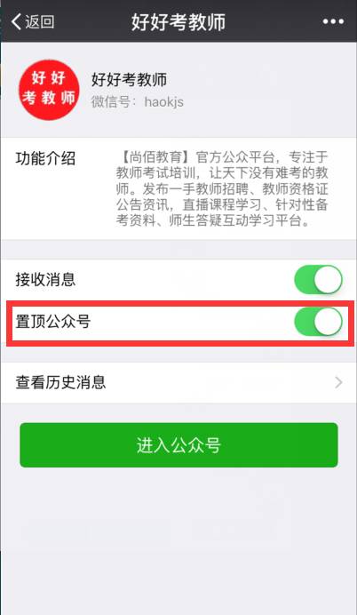 有没有觉得公众号很多不想翻开?没关系!我教你如何置顶!如图,点进我们的公众号,点击“置顶公众号”。这样,我们建立最亲密的联系啦!