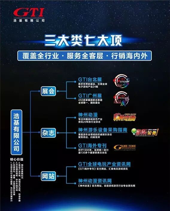 GTI/浩基有限公司旗下业务涵盖:GTI广州展/GTI台北展两大国际展会;《神州动漫》、《神州游乐设备采购指南》、《GTI国际专刊》3大杂志;《GTI全球电玩产业资讯网》、《神州动漫资讯网》等覆盖全游戏游艺行业的“三大类七大项”,全心服务全客层,协助中国产品行销海内外。