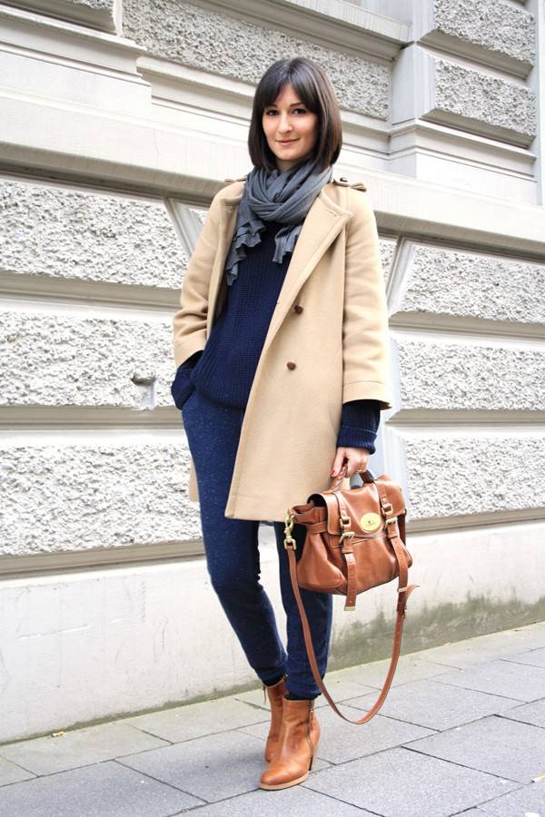 浅驼色长款大衣+蓝色套头毛衣+杂色休闲长裤+棕色拉链粗跟靴