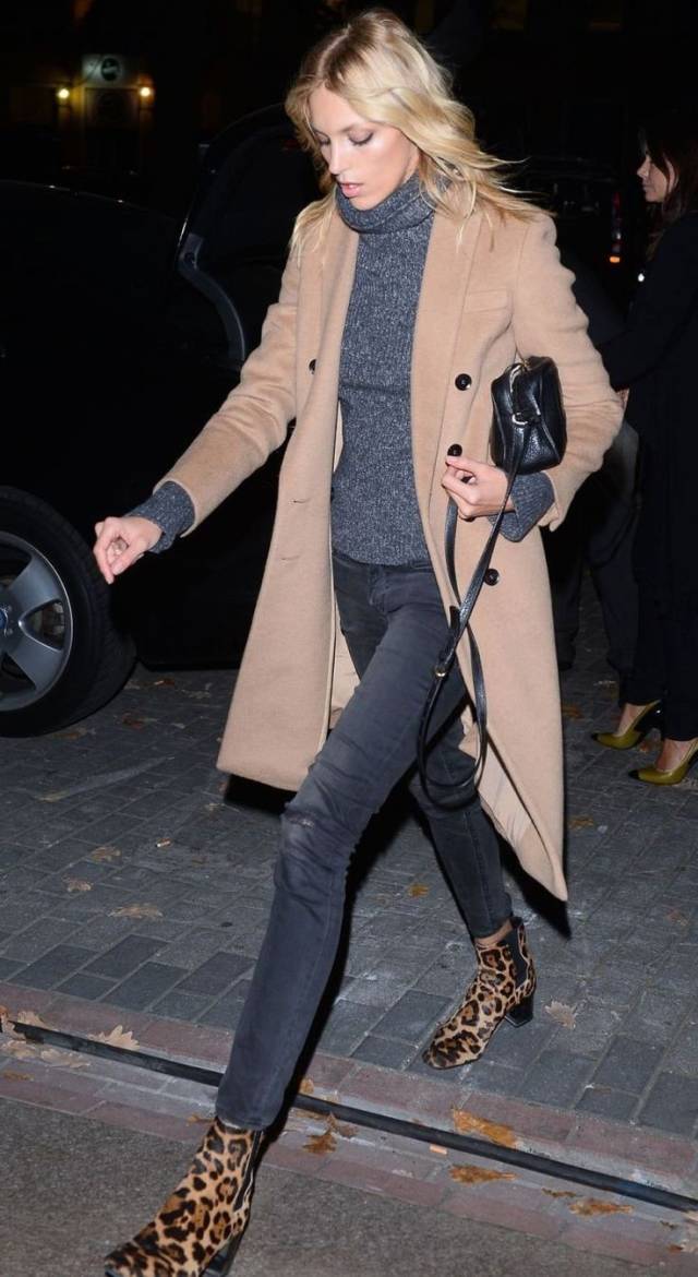 驼色长款大衣+高领针织衫+烟灰色小脚裤+豹纹粗跟短靴