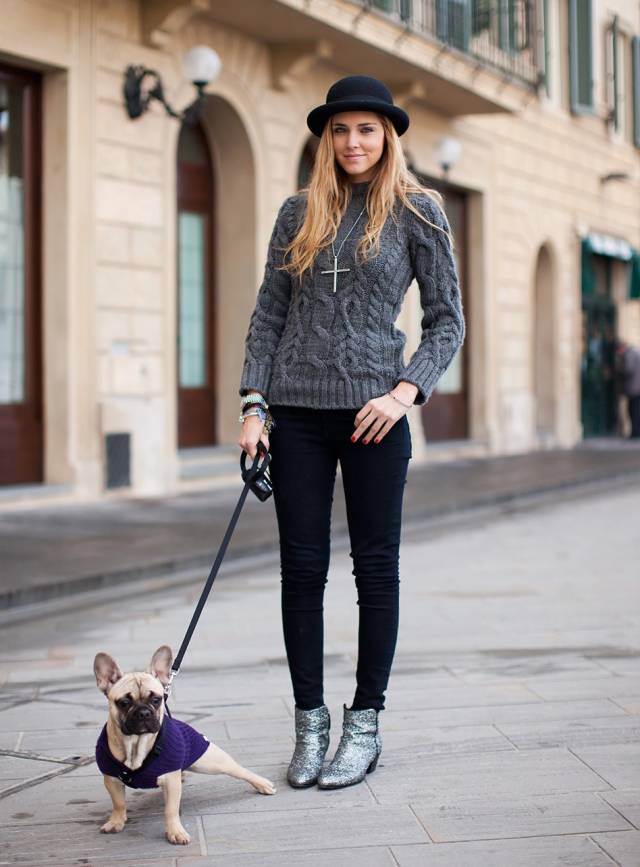 深灰色套头毛衣+黑色小脚裤+银色及踝粗跟靴