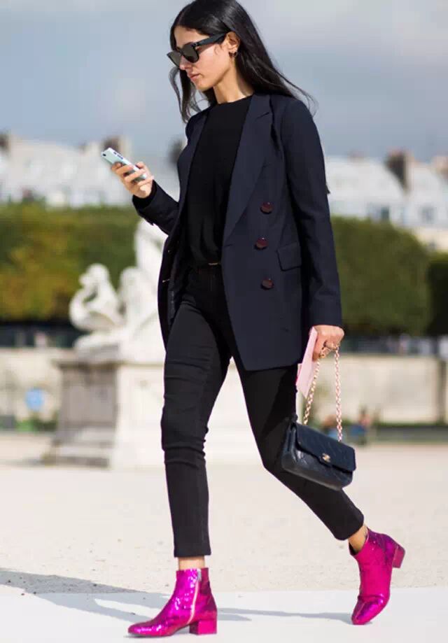 深蓝色西服外套+黑色打底裤+黑色针织衫+菱格链条包+荧光粉粗跟靴