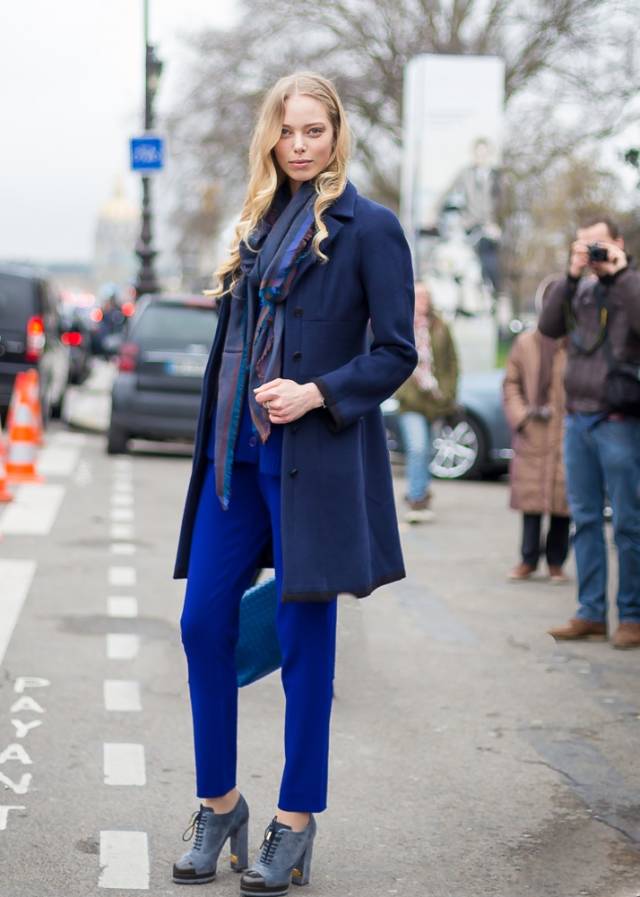 藏青长款风衣+宝蓝色毛衣外套+宝蓝色西装长裤+孔雀蓝麂皮系带粗跟靴