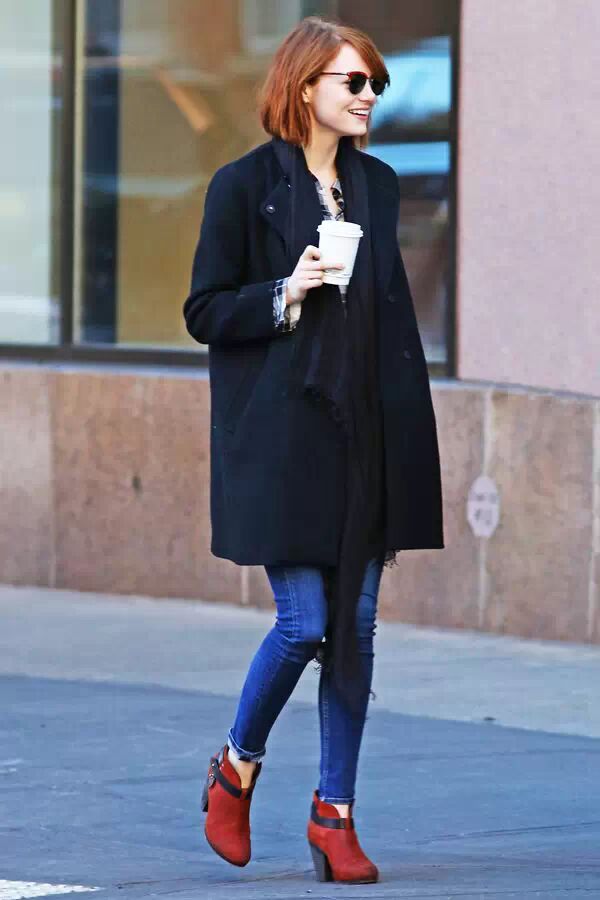 黑色中长款外套+牛仔小脚裤+橘红色粗跟短靴+格纹衬衫
