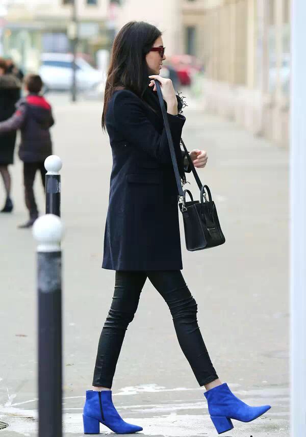 深蓝色西服外套+黑色仿皮裤+宝蓝色尖头短靴+黑色笑脸包