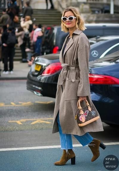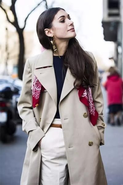 可以用配饰转移全身的焦点,比如精致复古的耳饰或是一件腰带,都让整体look看上去更加的和谐,不会让人只关注到风衣本身。