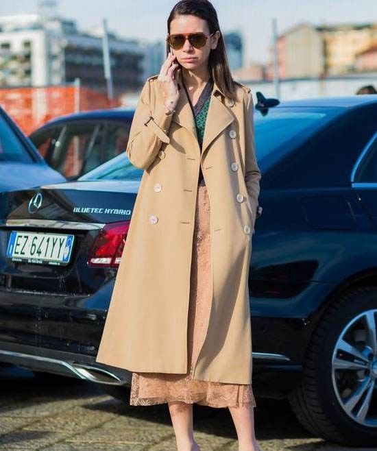 穿里外一样长,就是说内搭的连衣裙或是短裙可以和中长款风衣几乎一样长,甚至风衣长个边,这样看上风衣就像是穿着裙子,及其优雅。