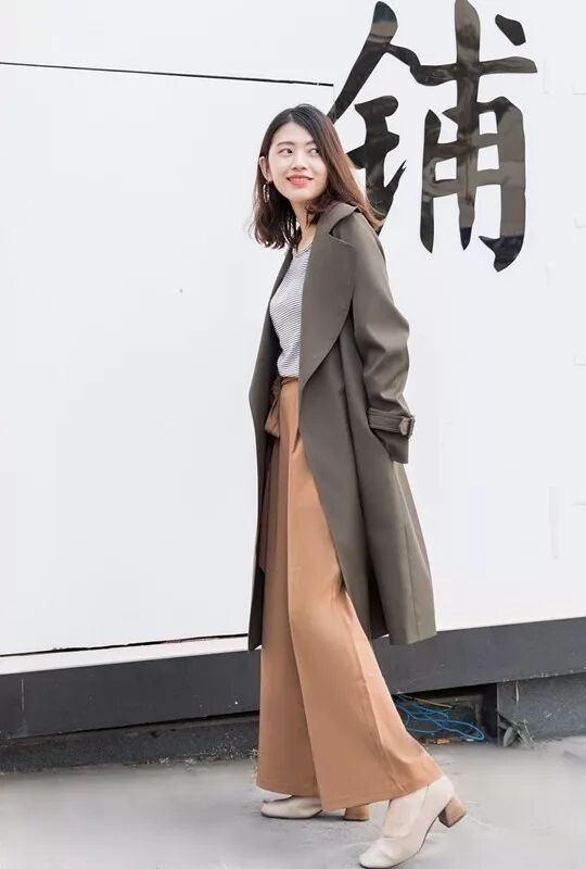 军绿色风衣的内搭是很秋天的卡其色阔腿裤,再加上驼色的贝雷帽,酷酷的中性路线里透漏出一丝的少女温柔~