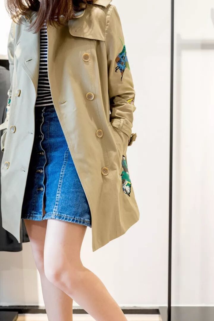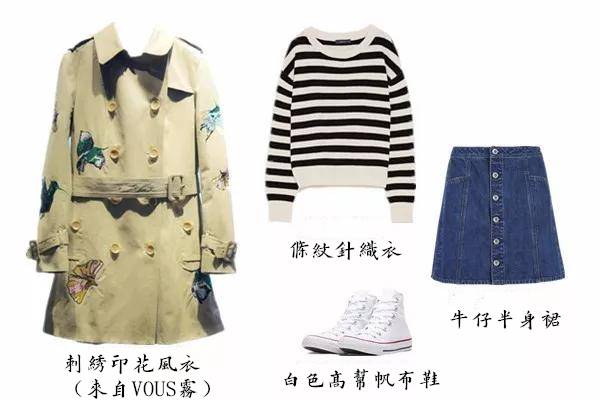 刺绣款风衣比较俏皮和学院风,适合比较休闲日常的穿搭,条纹针织和牛仔半裙作为百搭款的百搭品来搭配就绝对错不了。