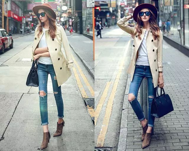 经典的中长款版型,修身显瘦,双排扣设计,防风保暖,搭配破洞牛仔裤,彰显大牌的风范。