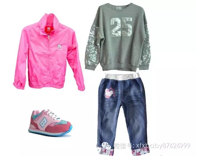 时尚闪亮的卫衣配休闲牛仔裤,运动鞋与防风衣,出门游玩自在轻松。