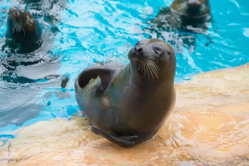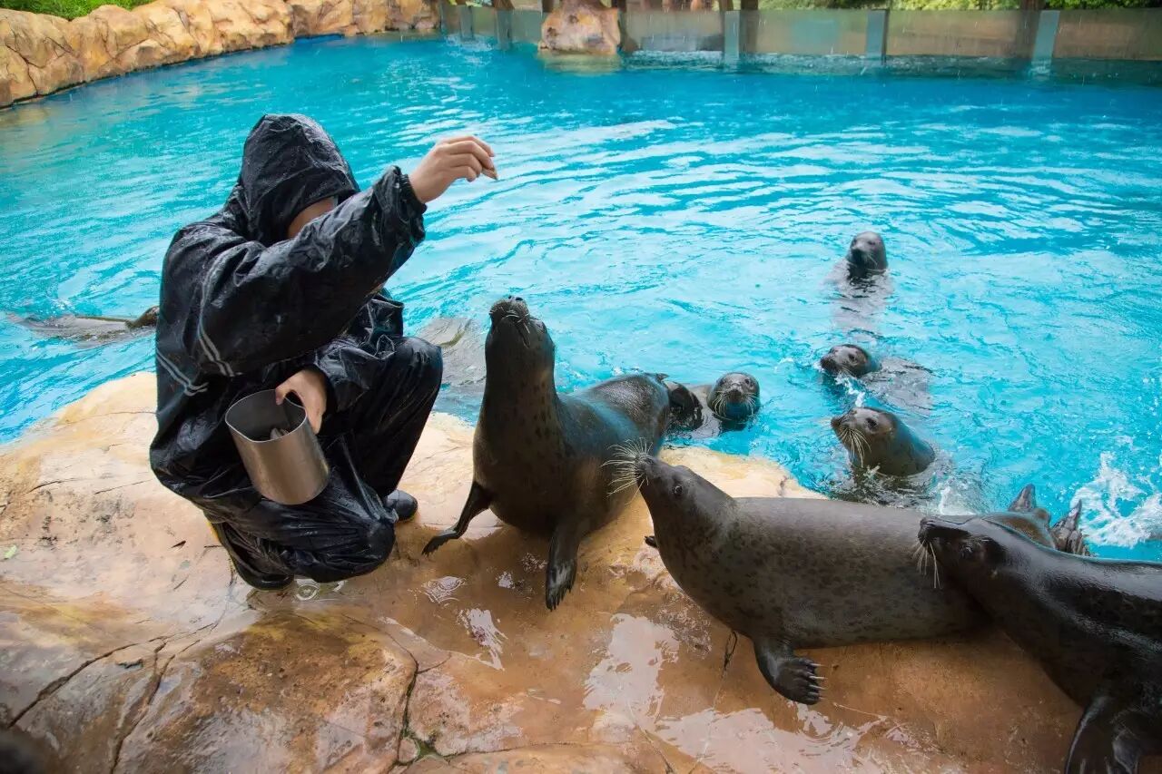 而像水獭、海狮、海豹等两栖动物日常都会有自己的住所,所以工作人员就用食物引导它们进笼避开台风。吃货就是容易解决啊~