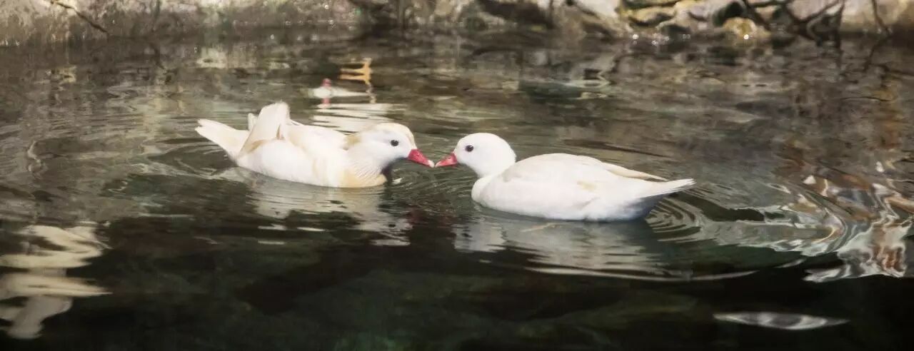 台企鹅馆内,一对鸳鸯在亲嘴嬉戏。