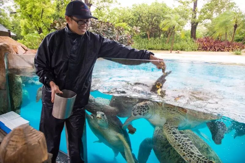 尽管有台风,海鸟世界的海龟们依然准时开饭。
