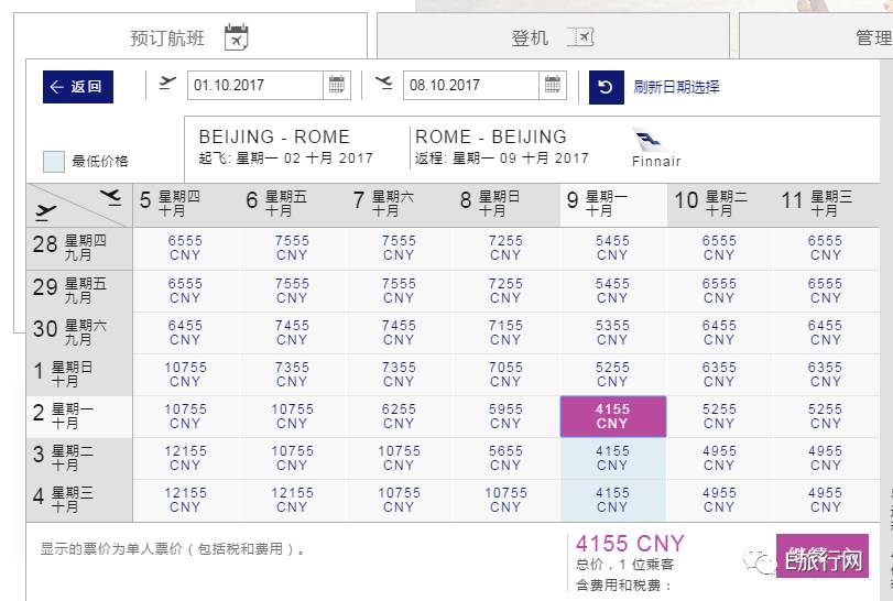 北京出发价格也不错,往返罗马,去程10月2日,回程10月9日,含税4155元