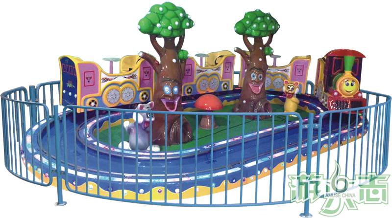树木苍翠的森林、活泼可爱的小动物、美丽的蘑菇小屋……森林里一切美好的事物仿佛都聚集在这里了,当你乘坐好乐欣的玻璃钢七座仿古火车时,便能在室内看到这一切。没错,好乐欣将森林、车轨、火车都搬入室内了。快和小伙伴们一起来乘坐这辆有着马斯头像般造型的卡通火车头、公主马车般的梦幻车厢的小火车畅游森林吧!