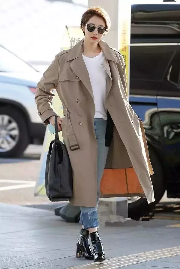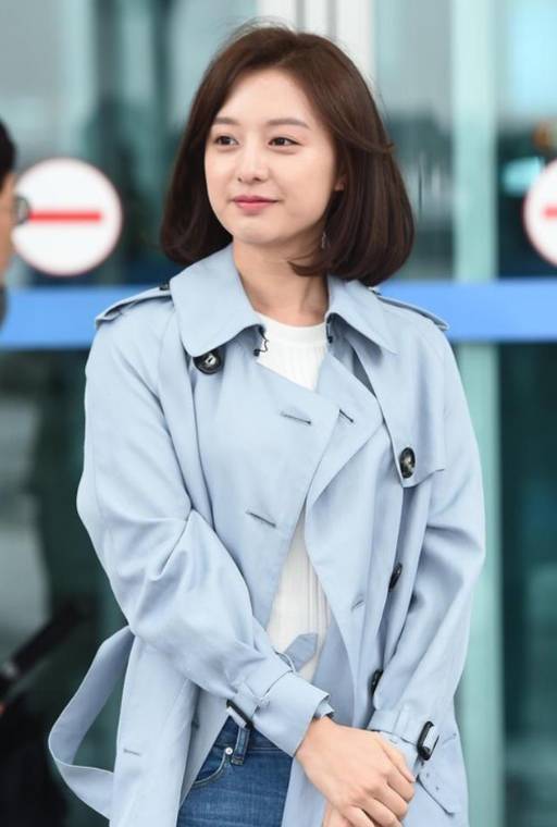凭借《太阳的后裔》走红的金智媛则选择了空气蓝外套,清新又美好。