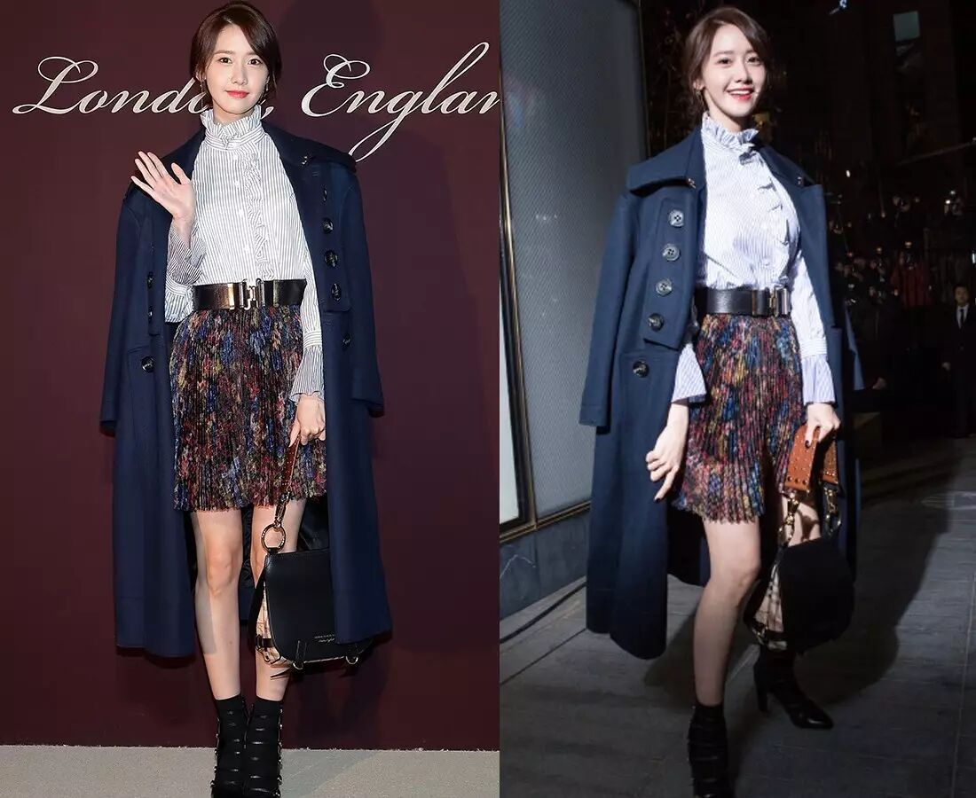 林允儿搭配印花百褶短裙+条纹荷叶边衬衫甜美可人,而有了这件河滨蓝大衣的加持,照样能够搭出高级感,精致之余又不失气场。