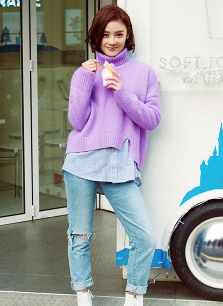 袁姗姗用高领紫色毛衣与条纹衬衫叠加,搭配牛仔裤,层次感满分又俏皮。