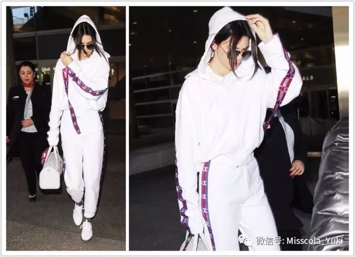 不同于Sara Donaldson的性感,肯达尔·詹娜 (Kendall Jenner)身着Vetements 白色连帽卫衣+同系列休闲裤,单品中的撞色飘带拼贴设计亮眼时髦增加帅气,搭配Balenciaga的厚底小白鞋与白色波士顿包整体舒适感十足。