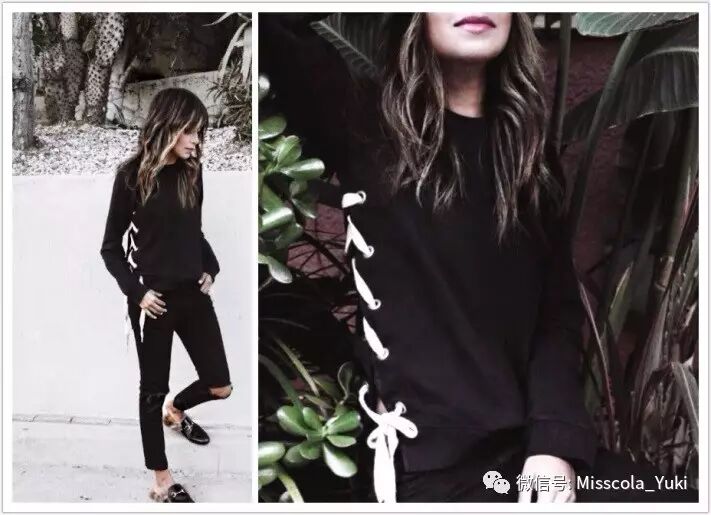 洛杉矶博主Julie Sarinana身穿系带细节套头衫搭配破洞紧身裤和毛毛鞋,黑白look随性舒适。加入了绑带元素的上装打破纯色的平凡无趣,增加吸睛度。
