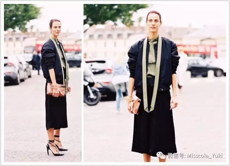 超模艾梅琳·瓦拉德 (Aymeline Valade)以藏青色飞行员夹克搭配同色系A字半裙,内搭芥绿色衬衫并以同系列飘带作配件,大方且高级感十足,深浅不一的同色系一直是搭配的好技巧,再选择不同的材质,最容易穿出高级感。