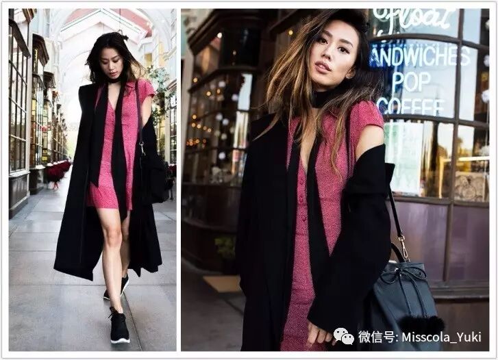 春天最适合穿各种红色粉色,洛杉矶时尚博主Jenny Ong身穿V领亮色连身裙搭配深色大衣,用同色系的飘带做配饰,运动鞋让整体look更休闲随性。裙装的桃红色,突显小女人的娇俏柔美。