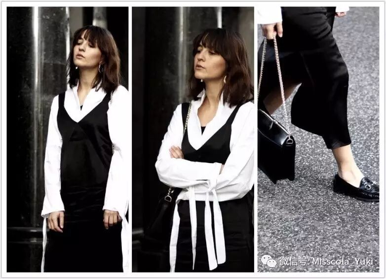 柏林时尚博主Anais Eleni身穿飘带衬衫搭配开衩吊带裙和乐福鞋,简约时髦。黑白配用金属色配饰点缀,夸张耳环是吸睛加分项。简约的穿搭用小细节增加设计感和时髦感是极其重要的让look更有看头的方法。