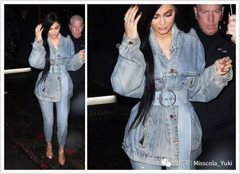 凯莉·詹娜 (Kylie Jenner)用宽腰带束腰突显腰身,而加长版的则更为灵动,全身牛仔装扮用透明高跟靴加持,Kylie这次造型不秀性感也很吸睛。