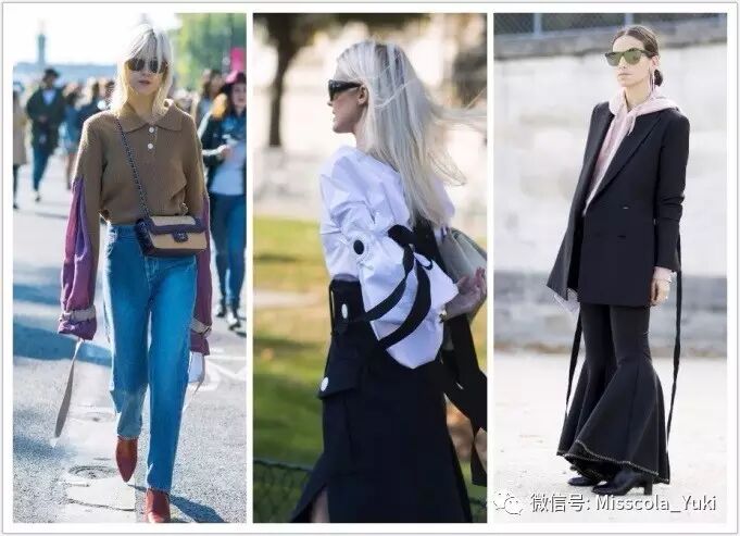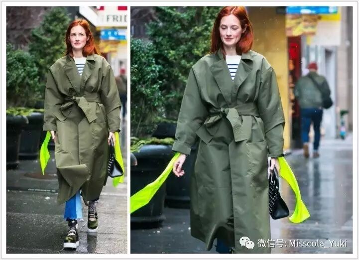 Taylor Tomasi Hill在纽约17秋冬时装周秀场外,她身穿一件基础款的条纹衫搭配上长款风衣与磨边裤,简洁又有显气质的一身,而袖口的荧光飘带简直不要太抢镜。