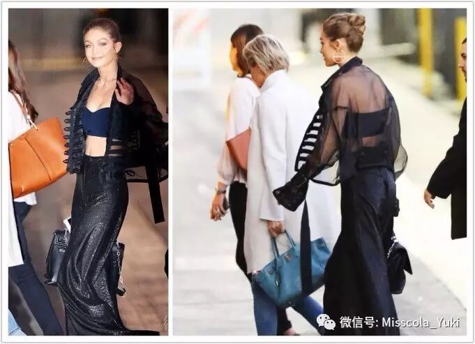 吉吉·哈迪德 (Gigi Hadid)身着透视外套+抹胸性感吸睛,长阔腿裤match同色高跟鞋更显气质出众,袖子的飘带设计为大面积黑色look注入灵动feel,欲露又遮的透视和灵动的飘带是Gigi的小tips~