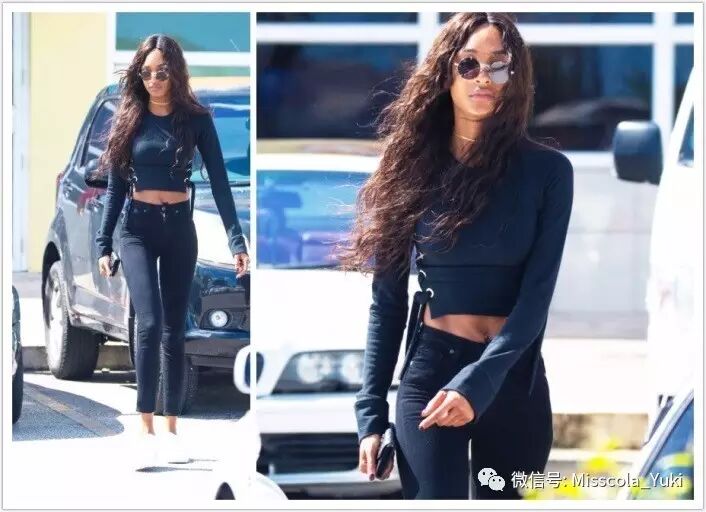 绑带毛衣和高腰裤一直是好伙伴,卓丹·邓 (Jourdan Dunn)身着一件藏青色两侧绑带Grop Top,下身搭配深色牛仔七分裤+小白鞋与上身统一色调和风格,简单舒适的搭配绑带元素增加设计感。
