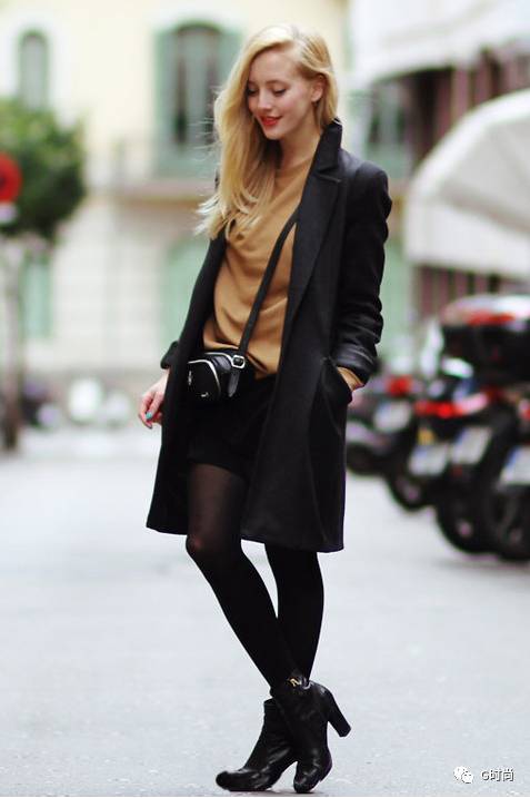 棕色的打底衫外套一件毛呢大衣,黑色的丝袜搭配短靴性感迷人,微微一笑更有小女人的feel。