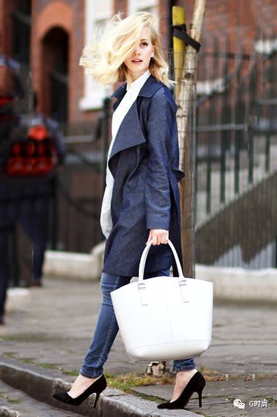 蓝色的长风衣搭配白色的手袋,大气时尚。回眸一笑的街拍姿势国际范满满。