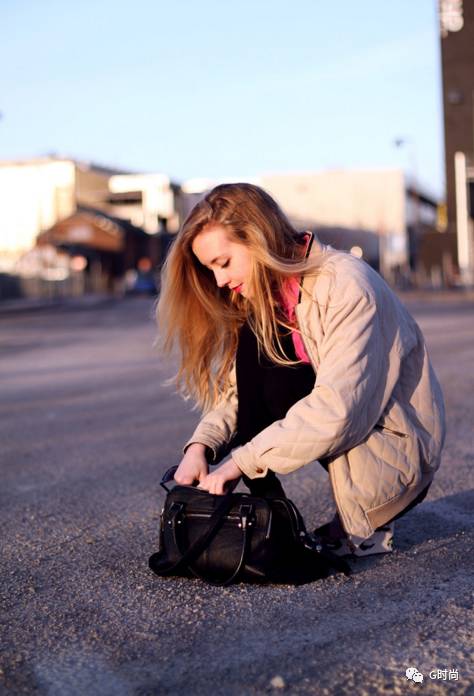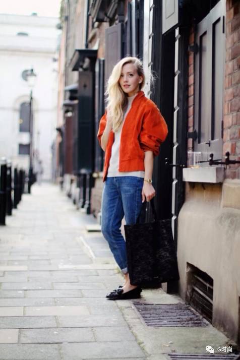 金色的头发,橙色的夹克外套,鲜艳的搭配,再搭配黑色的手提包。复古潮流也很适合小个子哦。