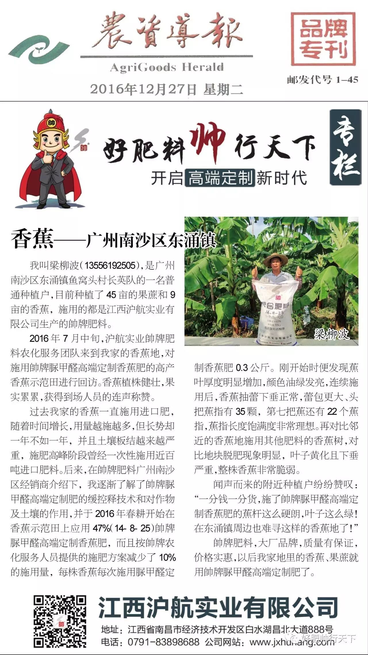 我叫梁柳波(13556192505),是广州南沙区东涌镇鱼窝头村长英队的一名普通种植户,目前种植了45亩的果蔗和9亩的香蕉,施用的都是江西沪航实业有限公司生产的帥牌肥料。