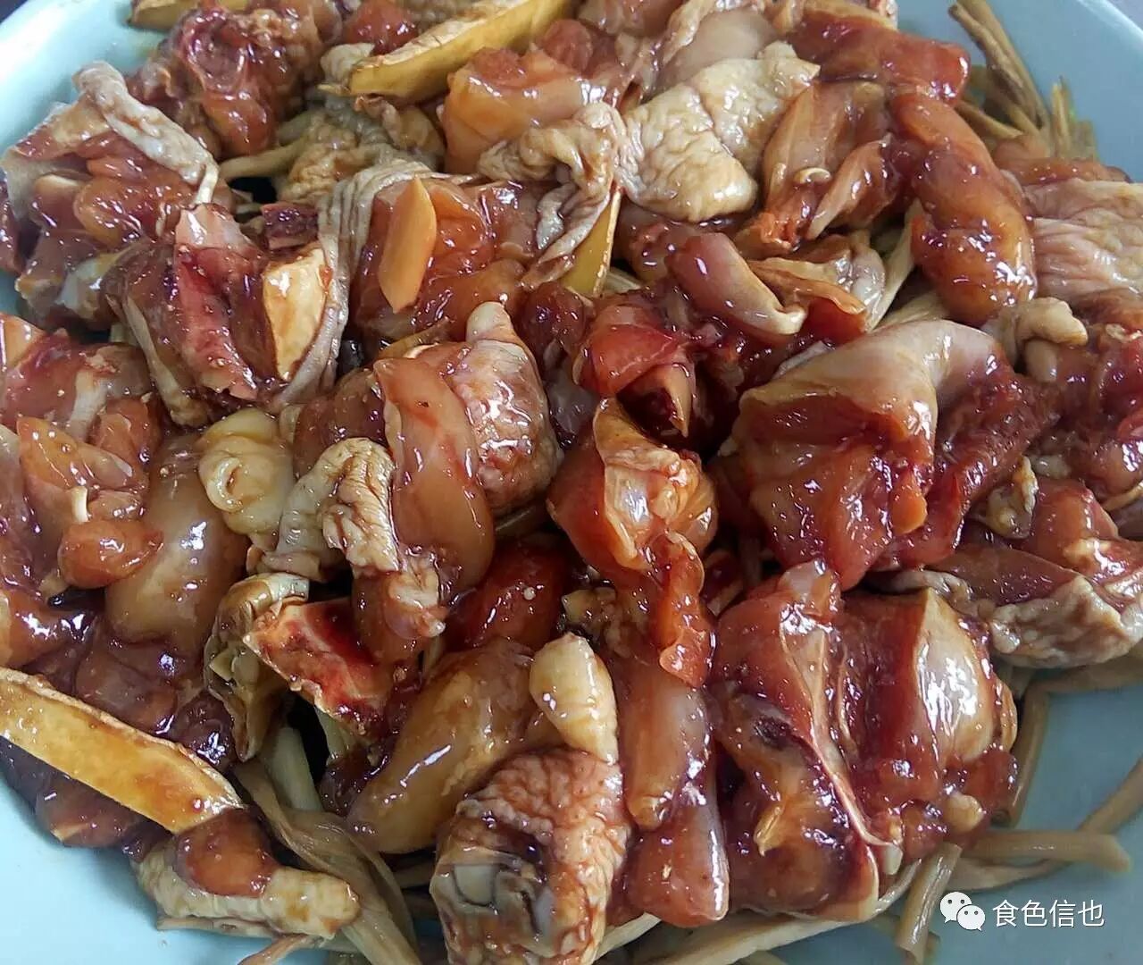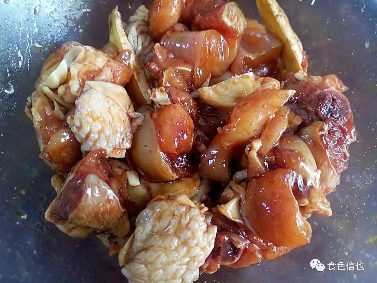 2:鸡肉剁块。鸡肉用好点的土鸡做出来味道最鲜美。我就直接用的冰冻鸡腿了。鸡翅也可以。剁好的鸡块放生姜,蚝油,生抽,盐,白糖,料酒,白胡椒粉,抓匀腌制二十分钟。