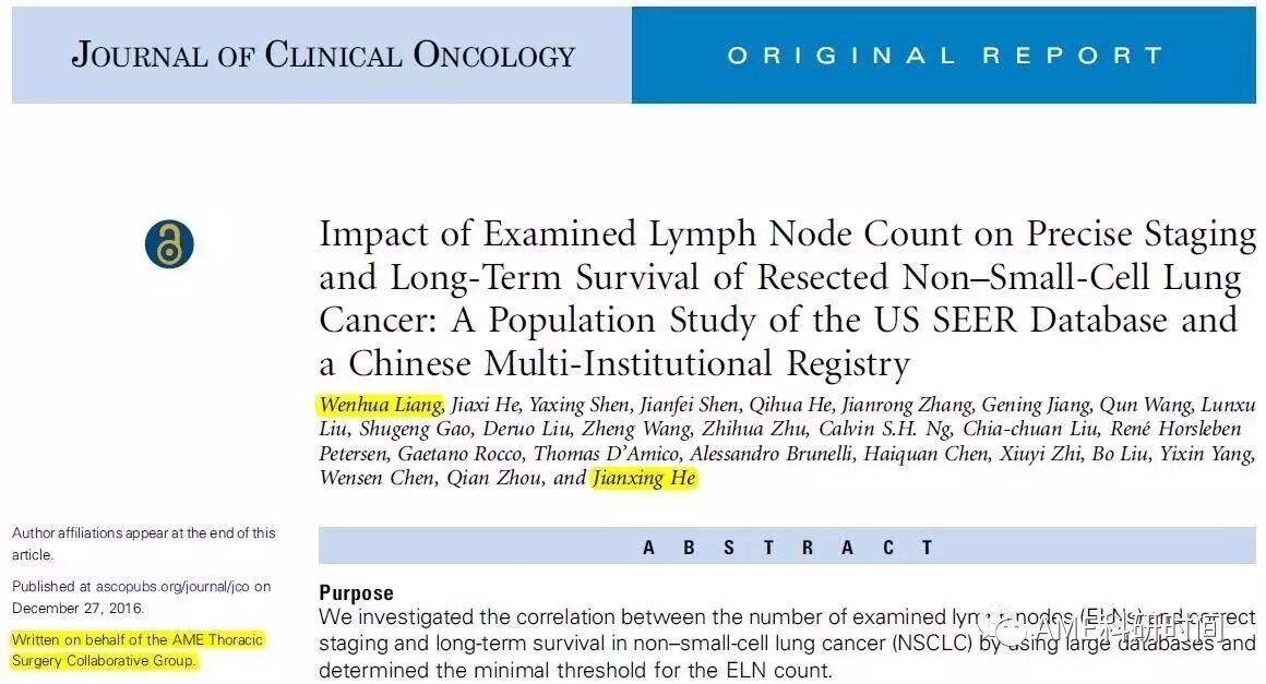 这个这是何建行教授团队在2016年继7月份发表新分期下早期肺癌手术切除范围的研究(戴晨阳,沈建飞等,J Clin Oncol 2016 Sep 10;34(26):3175-82.)后的第二篇 J Clin Oncol 论文,也是何建行教授及梁文华博士继2015年发表预测肺癌生存列线图后又一次踏入这个国际学术殿堂(J Clin Oncol 2015 Mar 10;33(8):861-9.)。何建行教授团队是目前国内甚至国际上胸部肿瘤领域为数极少的在 J Clin Oncol 发表3篇或以上原创性分析研究的课题组,以其为突出代表的由众多国际专家组成的 AME thoracic surgery collaborative group,为早期肺癌的规范化治疗作出了重大贡献。