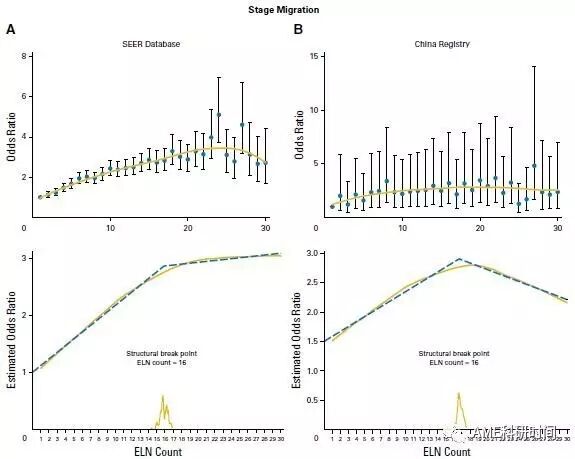 肺癌淋巴结转移状态是决定患者预后的关键因素,因此淋巴结采样/清扫对准确分期以及后续治疗的给予均有非常重要的意义,然而,既往一些零散的报道受限于数据偏倚及分析方法等原因,结果差异较大,因此在肺癌的治疗规范里一直没有形成针对评判采样/清扫是否充分的量化标准的共识。何建行教授的团队在国际胸外科专家组的共同指导下,运用更为可靠的统计学方法,仔细分析了美国SEER肺癌数据以及国内多家胸外科中心组成的肺癌数据库,发现更多的淋巴结采样数目与更多的分期迁移(代表更准确的分期)以及更好的远期生存相关。进一步的分析发现,尽管美国与中国在淋巴结采样数目的分布上差异很大,但分期迁移及生存转归的趋势结构转折截点,均定位在16个附近。因此,对于术后被判为淋巴结阴性的早期肺癌,推荐以16个采样淋巴结个数为重要节点,采样低于16个的患者很有可能包含一部分实际为淋巴结阳性转移的病人,这部分患者可能会由于癌细胞残留或没有接受适当的后续治疗而造成生存下降。